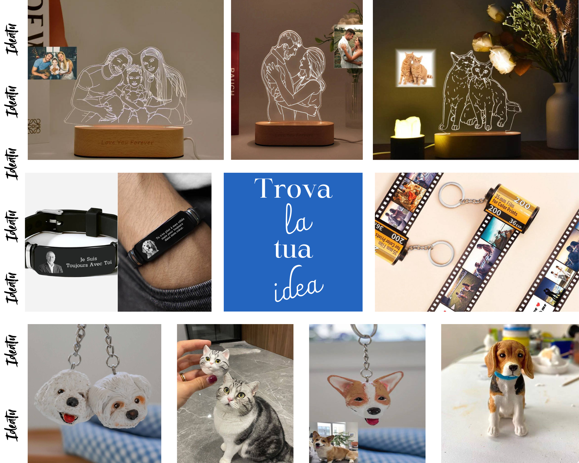 Realizziamo creazioni personalizzate partendo dalle tue foto: bracciali con immagini e dediche, portachiavi 3D, calamite, modellini completi, clip per auto e lampade 3D di persone, animali, coppie e famiglie. Tu ci invii la foto, noi la trasformiamo in un ricordo unico.